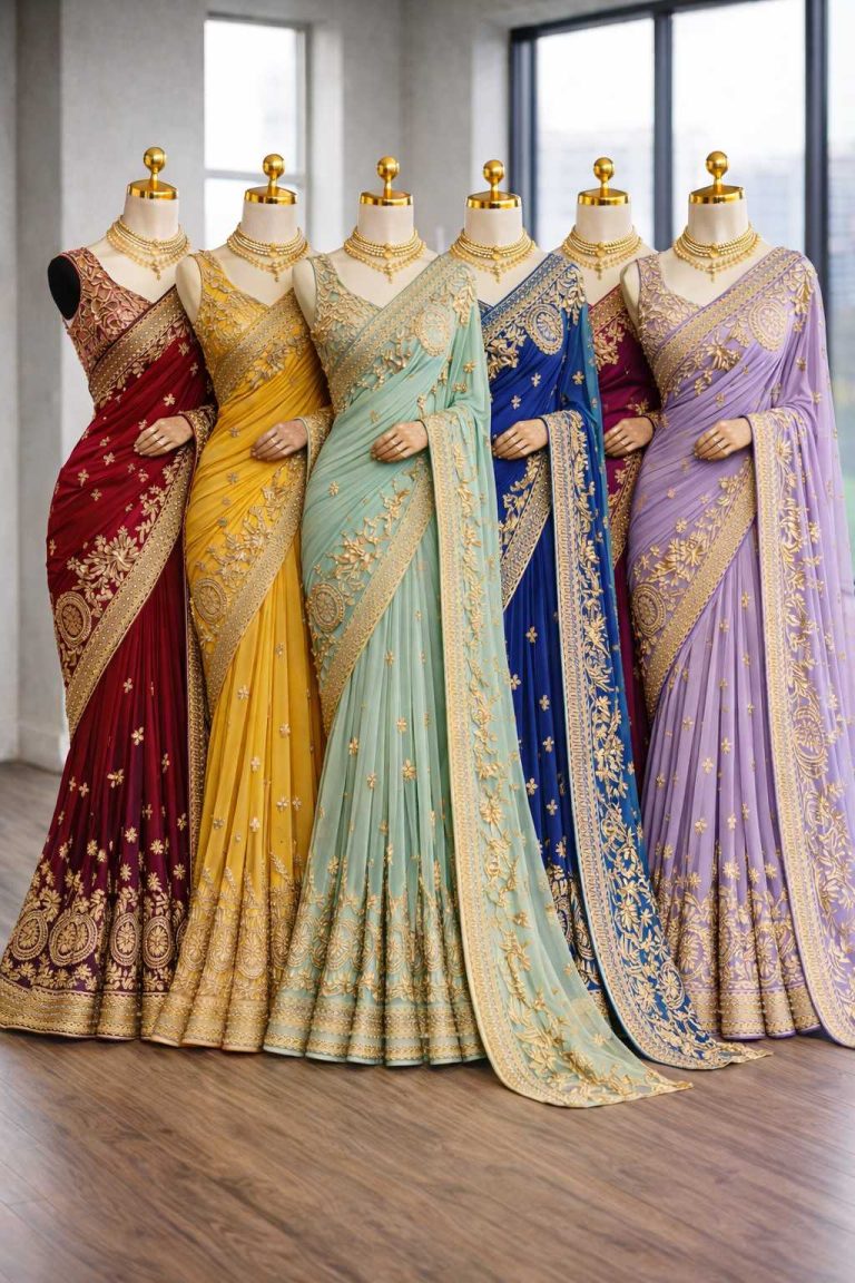Luxury designer sarees continue to dominate wedding and festive fashion trends in 2026. The featured collection highlights two breathtaking embroidered …