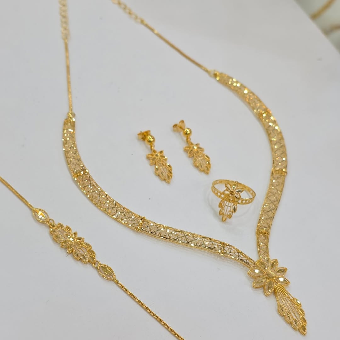 Jewellery trends in 2026 are embracing refined elegance, lightweight comfort, and floral-inspired craftsmanship. The collection shown above features a beautifully coordinated 22K gold necklace set that includes a matching necklace, earrings, ring, and bracelet — all designed with delicate floral patterns and intricate detailing.