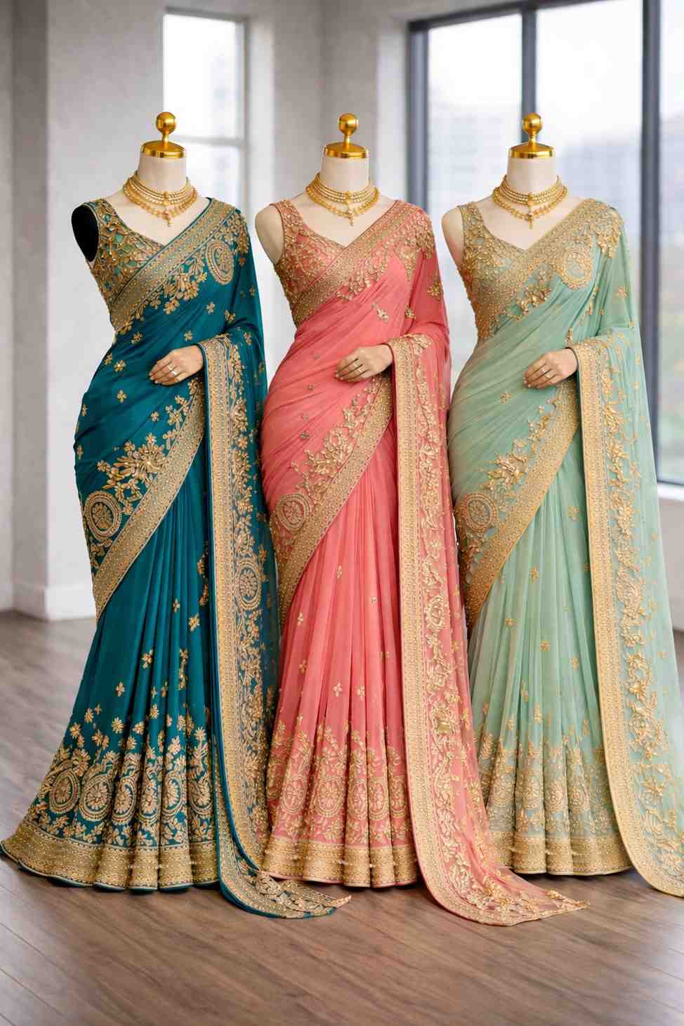 Sarees have always been a symbol of elegance, culture, and timeless fashion. The sarees showcased in this image represent a premium designer saree collection that blends traditional craftsmanship with modern aesthetics. Featuring rich fabrics, intricate patterns, and eye-catching colors, these three sarees are perfect for weddings, festive occasions, parties, and formal cultural events.