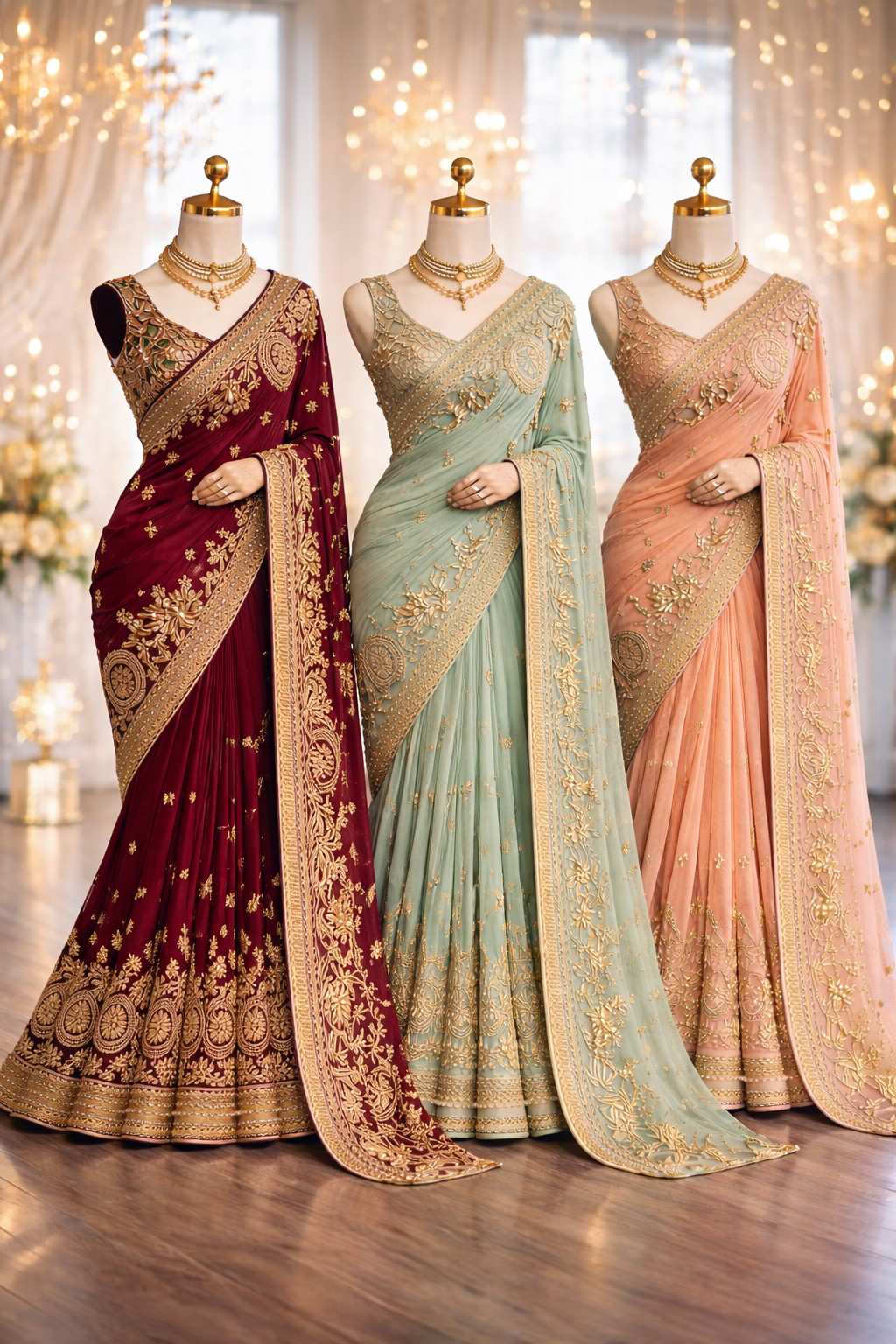 Designer sarees with intricate gold embroidery, sequins, and beadwork continue to be a symbol of elegance and grandeur in 2026. The collection highlighted here features three stunning sarees in burgundy, mint green, and peach, each crafted with meticulous attention to detail. These sarees are perfect for weddings, receptions, festive occasions, and high-profile cultural events. In this article, we provide a complete guide including design details, fabric quality, estimated prices across the USA, Bangladesh, and India, and trusted places to purchase them.